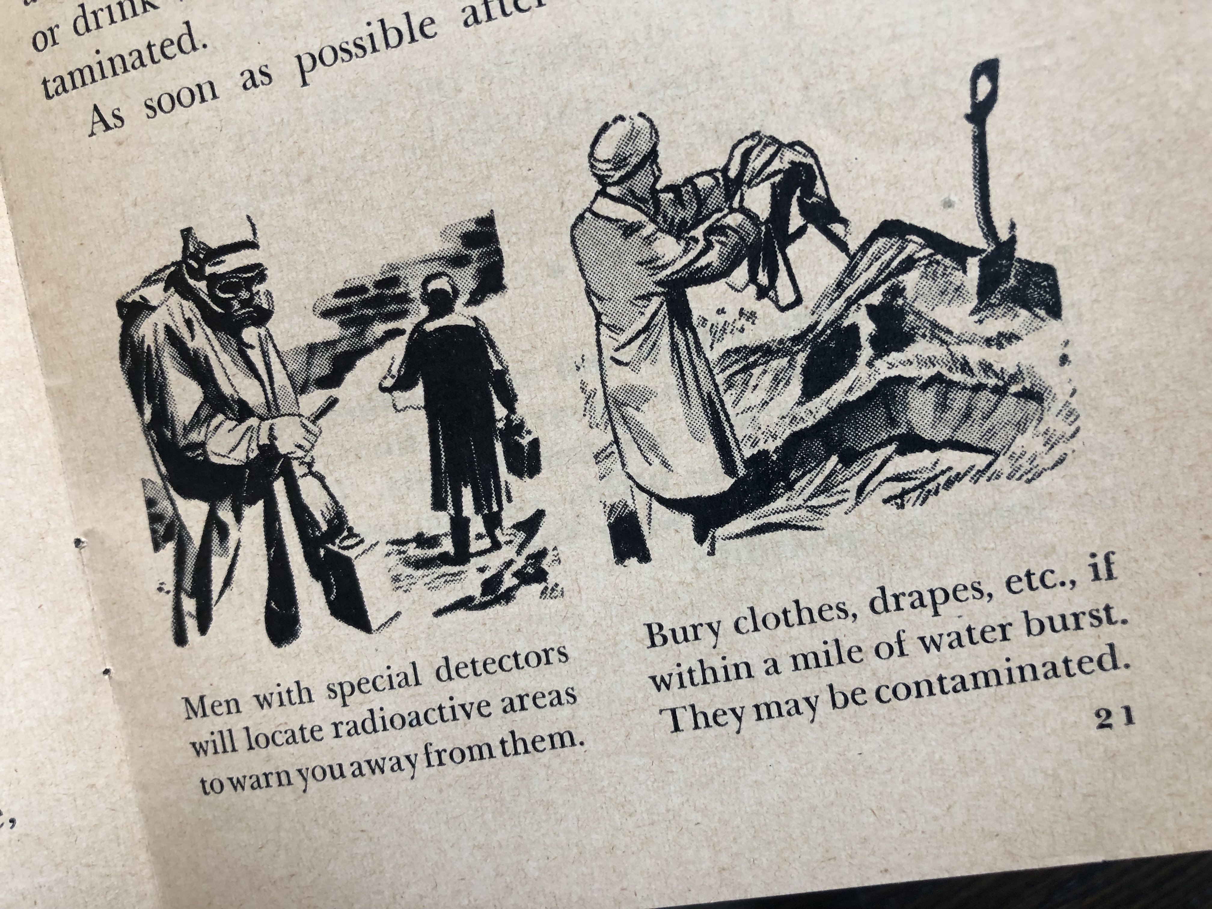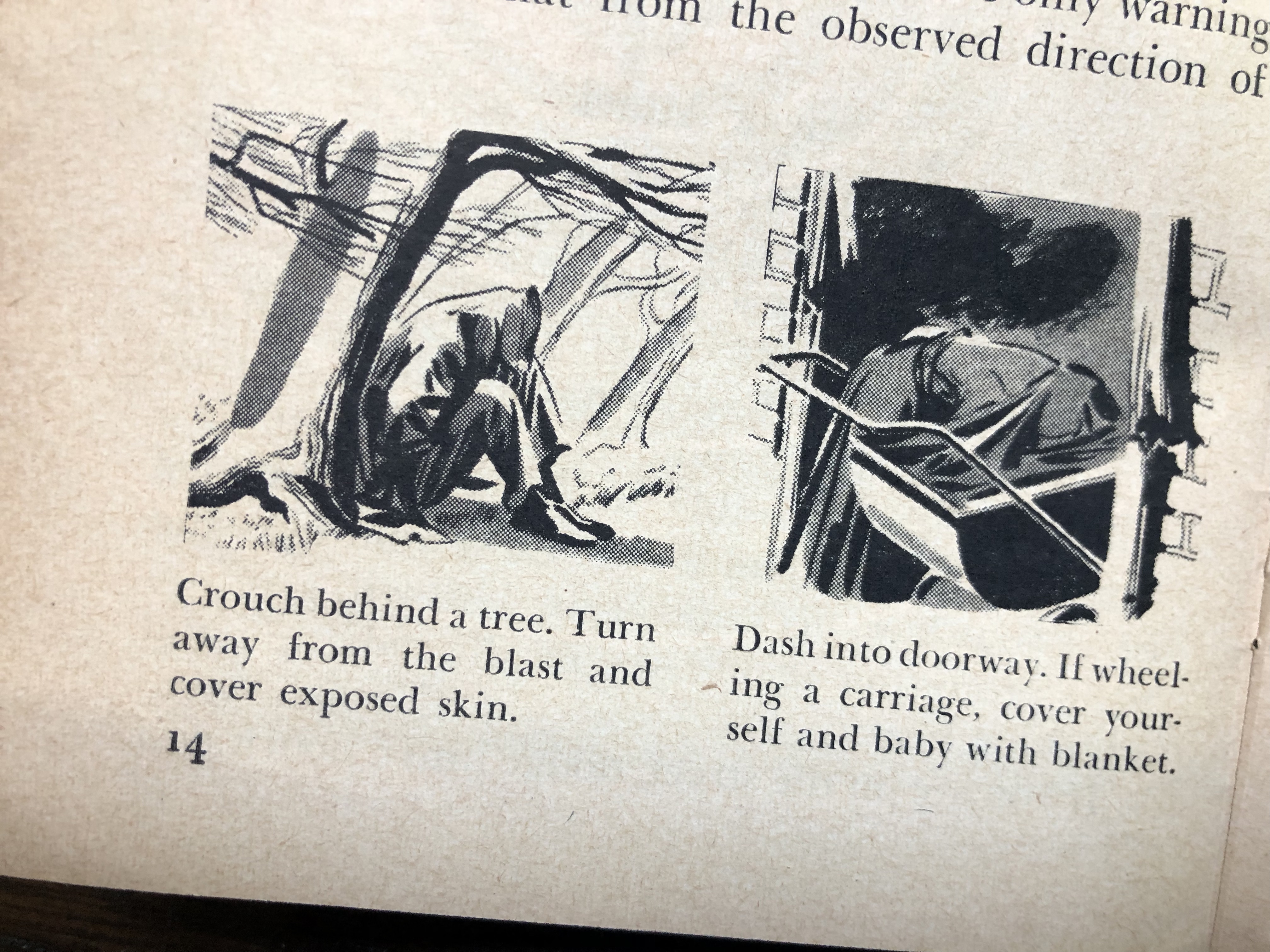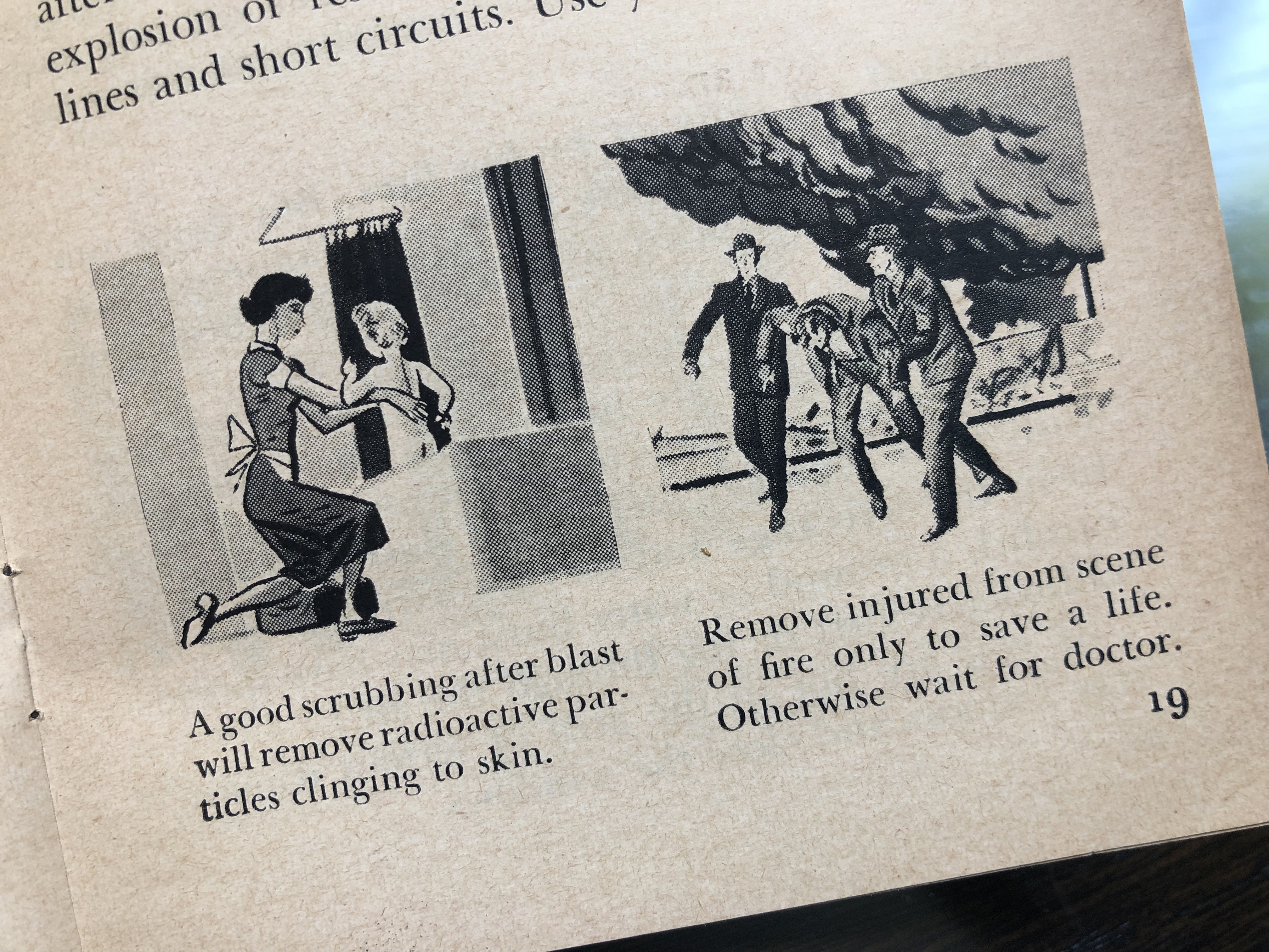 The pamphlet is rather informative, if not slightly naive. The illustrations are pretty good and include Manhattan getting a front-row view of a water burst (somebody had fun with that one.) There are the typical suggestions for when you’re caught out in the open during an attack. They include hiding behind a tree and covering your baby’s stroller with a blanket. Afterward, the booklet reassures the reader that emergency crews will rescue those trapped in buildings as bulldozers clear the streets (ha!) and that men with ‘special detectors’ will be by to locate and warn you of radioactive areas (yeah, right.) My favorite bit suggests a “good scrubbing” after the blast to remove radioactive particles… and the illustration is that of a mother (complete with a 1950s apron) bathing her child — later in the pamphlet, the reader is instructed not to turn on the water after a blast. Probably the most frequent suggestion in the book is: “Don’t get excited or excite others” — I guess you were expected to just die peacefully.