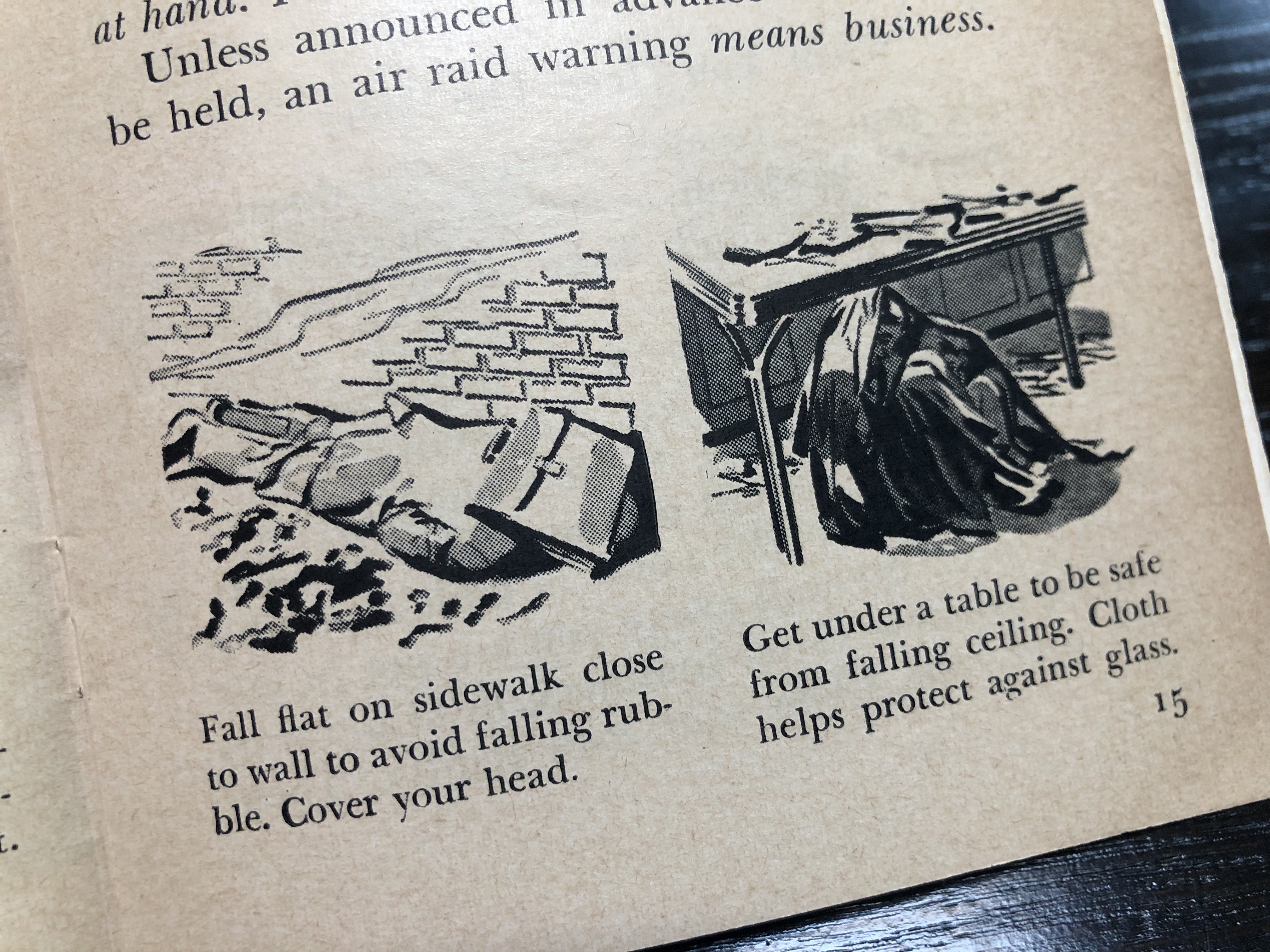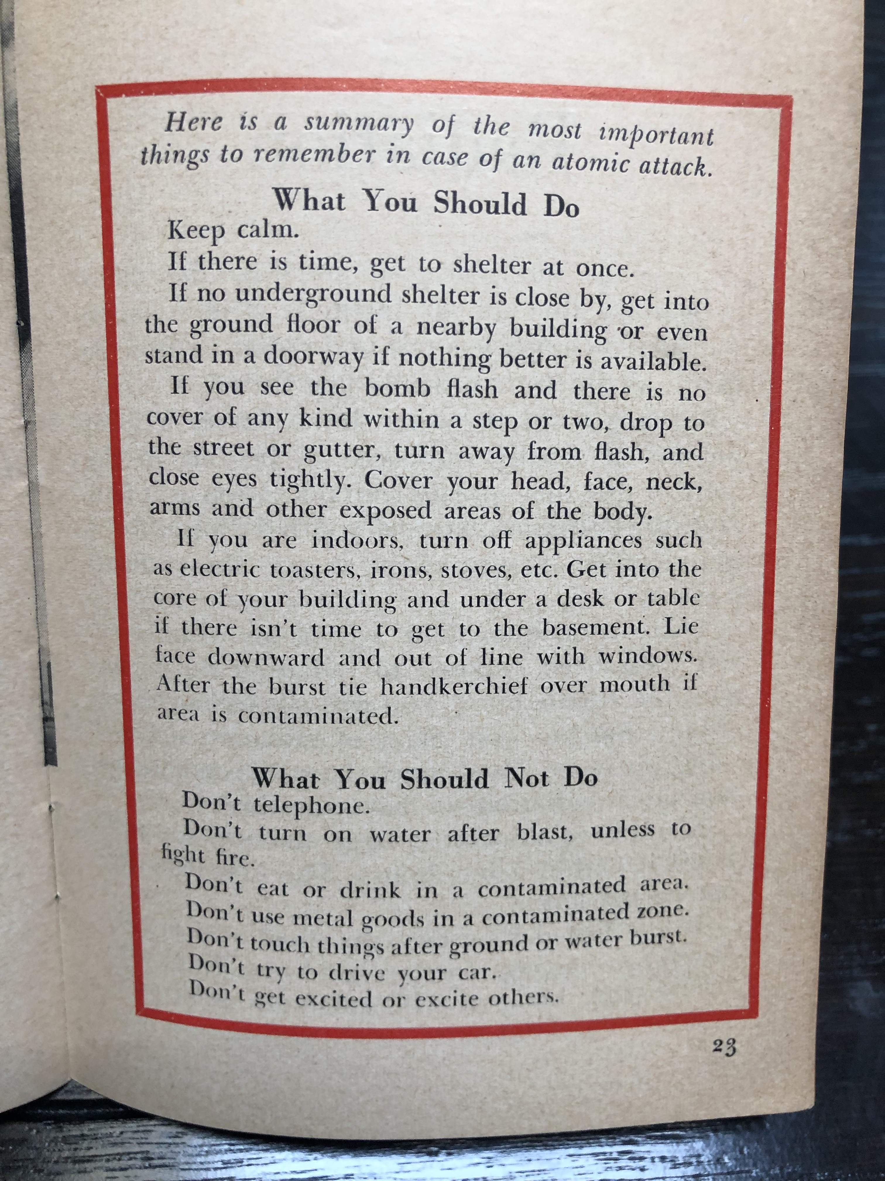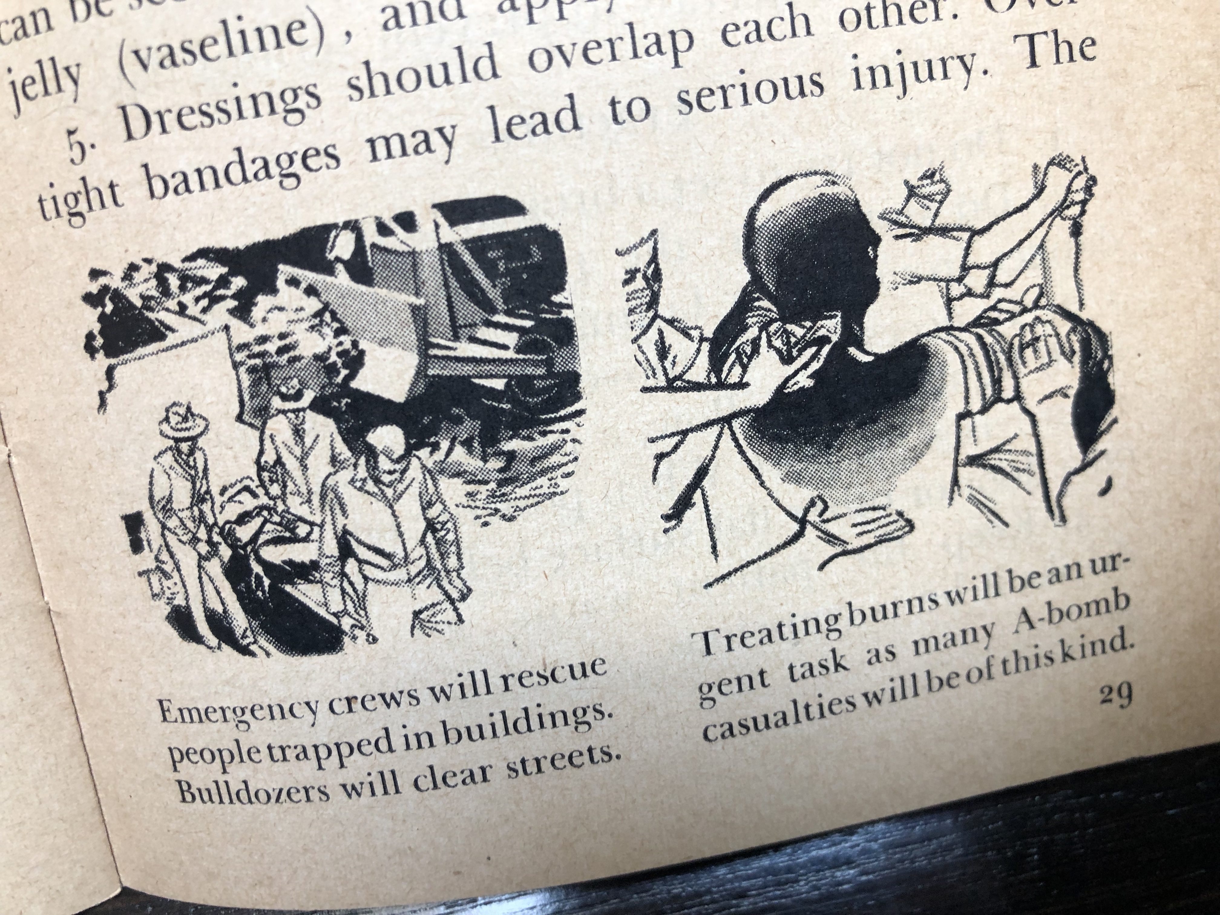 The pamphlet is rather informative, if not slightly naive. The illustrations are pretty good and include Manhattan getting a front-row view of a water burst (somebody had fun with that one.) There are the typical suggestions for when you’re caught out in the open during an attack. They include hiding behind a tree and covering your baby’s stroller with a blanket. Afterward, the booklet reassures the reader that emergency crews will rescue those trapped in buildings as bulldozers clear the streets (ha!) and that men with ‘special detectors’ will be by to locate and warn you of radioactive areas (yeah, right.) My favorite bit suggests a “good scrubbing” after the blast to remove radioactive particles… and the illustration is that of a mother (complete with a 1950s apron) bathing her child — later in the pamphlet, the reader is instructed not to turn on the water after a blast. Probably the most frequent suggestion in the book is: “Don’t get excited or excite others” — I guess you were expected to just die peacefully.